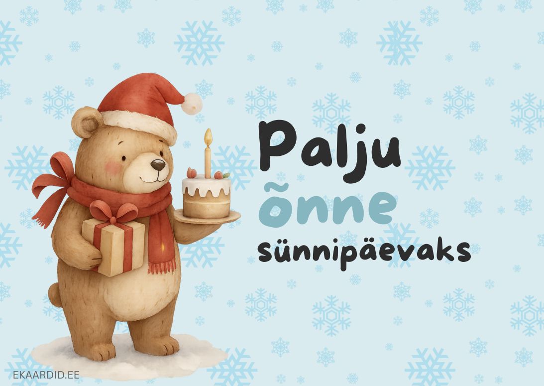 Soovi lähedasele palju õnne selle armsa talvise sünnipäevakaardiga, kus karu hoiab torti ja kingitust. Ideaalne viis saata soojad tervitused.