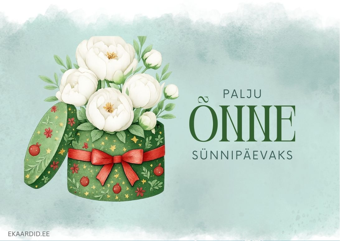 Valgete pojengidega jõuluteemaline sünnipäevakaart