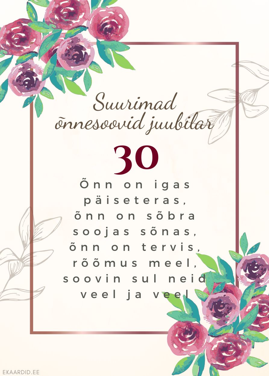 Soovi oma lähedasele 30. juubeli puhul palju õnne selle kauni lilledega kaardiga. See on ideaalne juubelikaart, mis väljendab sooje tundeid ja parimaid soove.