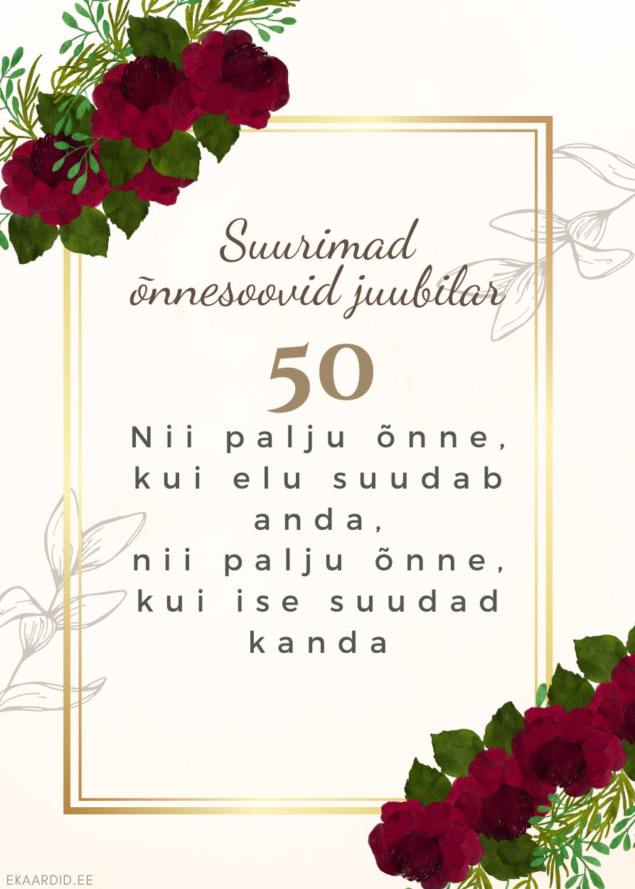 See on suurepärane juubelikaart 50. sünnipäevaks. Kaart on kaunistatud sügavpunaste roosidega ja kuldse raamiga. Soovi oma lähedasele palju õnne selle elegantse kaardiga.
