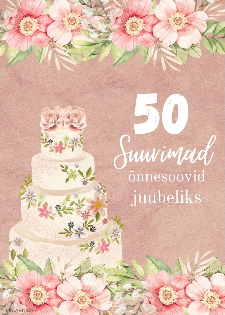See on suurepärane juubelikaart 50. sünnipäevaks. Kaart on kaunistatud lilledega ja elegantse koogi pildiga. Soovi oma lähedasele palju õnne selle kauni kaardiga.
