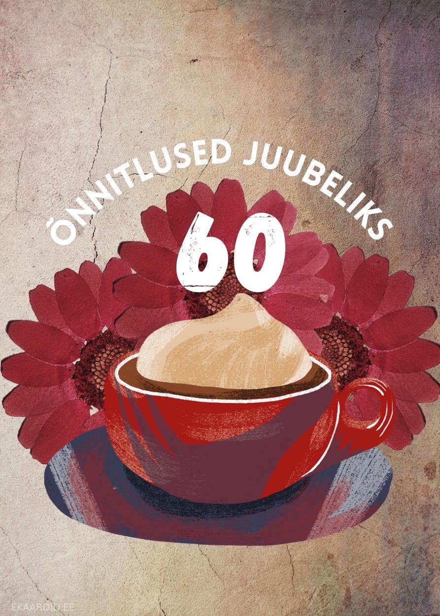 See elegantne juubelikaart sobib suurepäraselt 60. juubeli tähistamiseks. Punased gerberad ja soe kohvitass lisavad kaardile sooja ja pidulikku meeleolu.