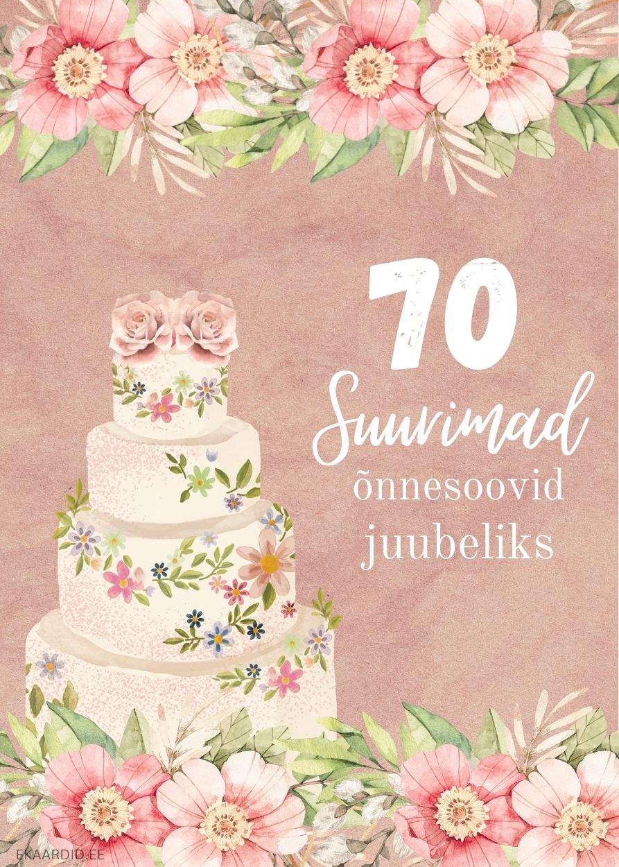 See on suurepärane juubelikaart 70. sünnipäevaks. Kaart on kaunistatud lilledega ja elegantse koogi kujutisega. Soovi oma lähedasele palju õnne selle kauni kaardiga!