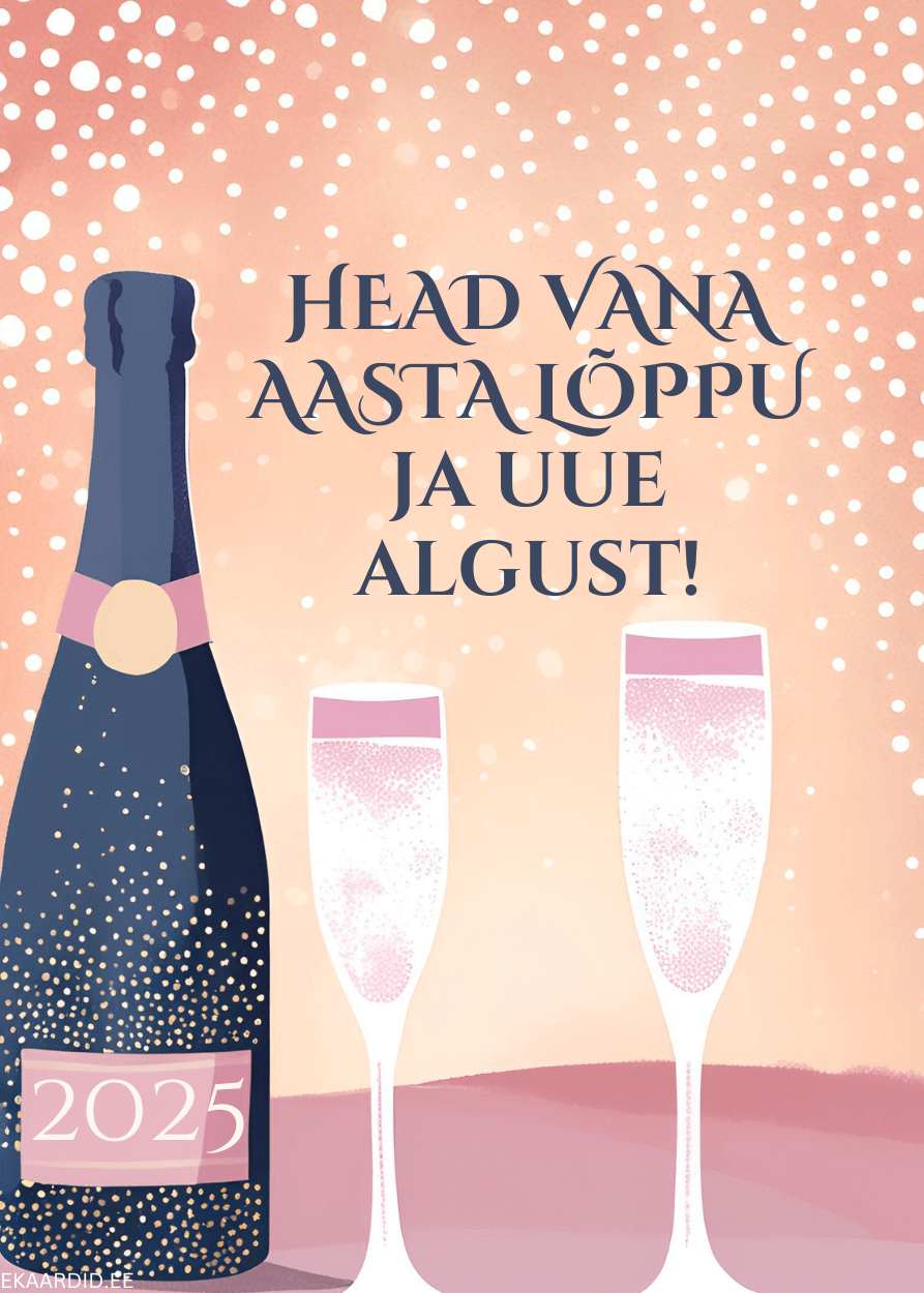 Soovi oma lähedastele head vana aasta lõppu ja uue algust selle elegantse aastavahetuse kaardiga. Kaardil on kujutatud šampanjapudeli ja -karikate pilt.