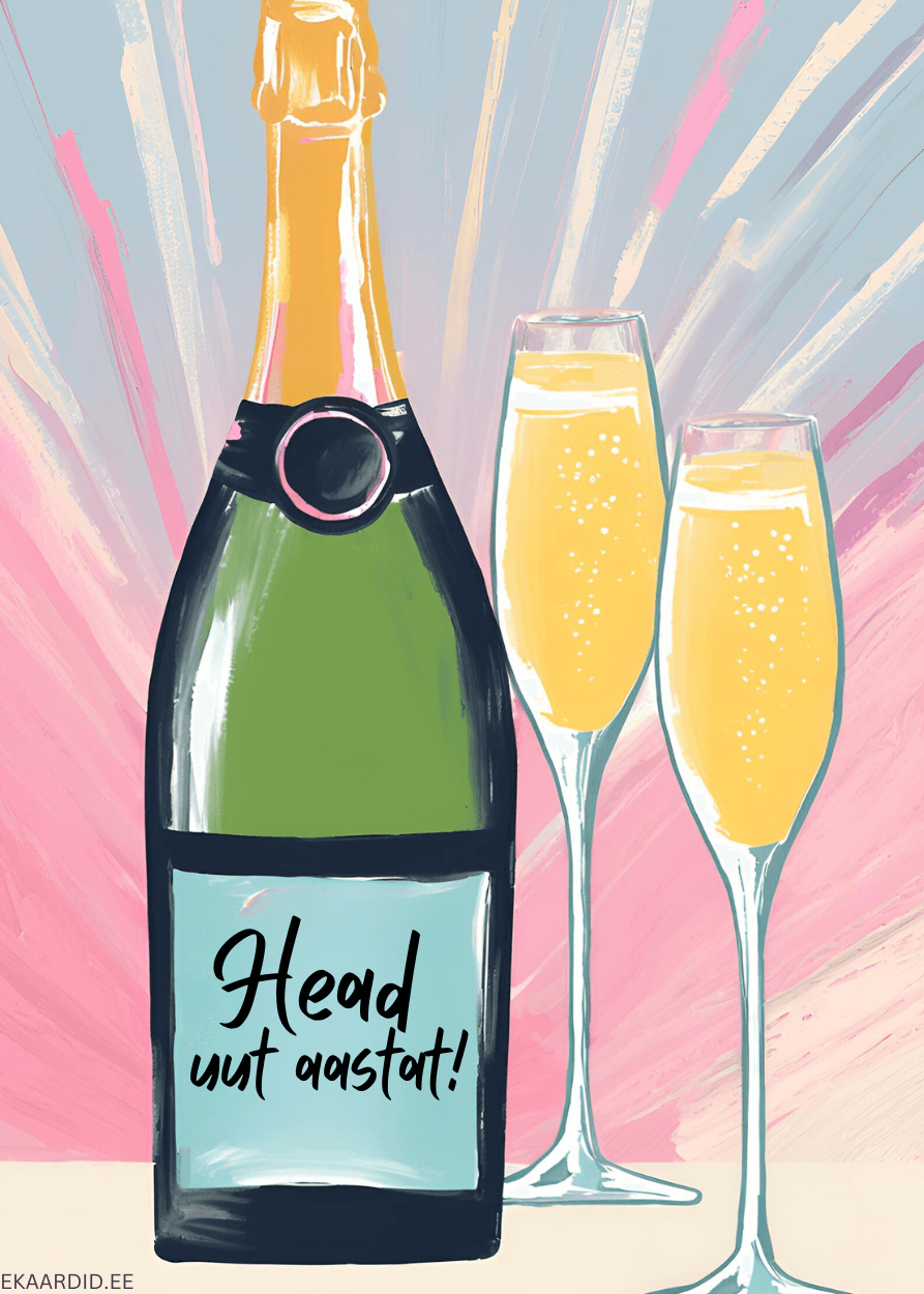 Soovi oma lähedastele head uut aastat selle elegantse šampanjapudeli ja -karikatega kaardiga. Ideaalne aastavahetuse tervituskaart.