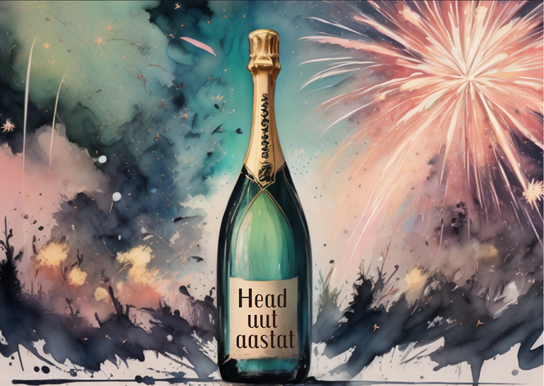 Aastavahetuse kaart šampanjapudeliga