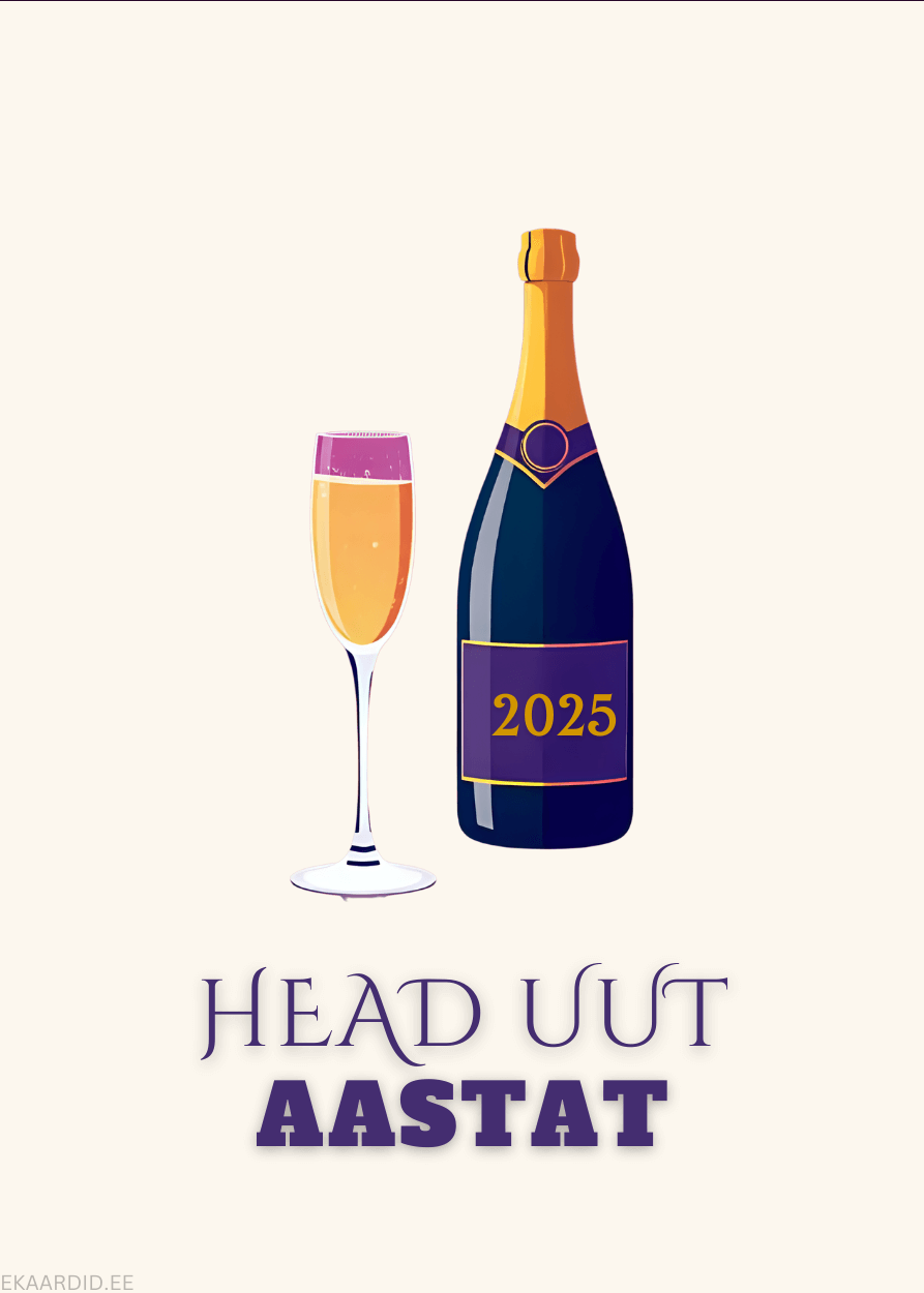 Soovi oma lähedastele head uut aastat selle elegantse kaardiga, millel on kujutatud šampanjapudeli ja -klaasi. Ideaalne kaart uue aasta alguse tähistamiseks.