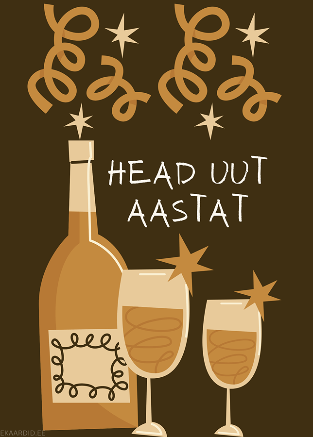 See on suurepärane aastavahetuse kaart, mis kujutab šampanjapudeli ja -klaase. Soovi oma lähedastele head uut aastat selle stiilse kaardiga!