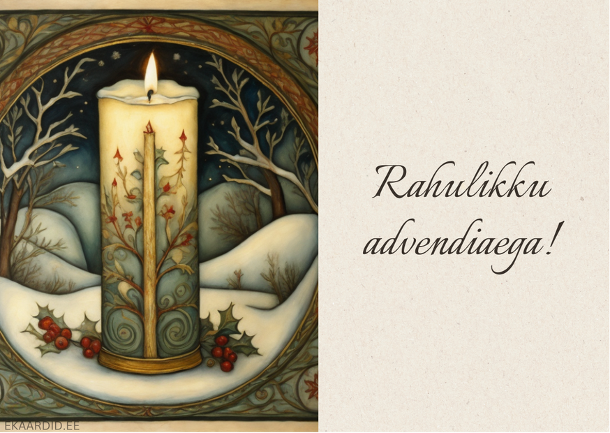 Sooja ja rahulikku advendiaja ootust sooviv kaart, millel on kujutatud põlev küünal lumemaastikul. See on ideaalne advendikaart lähedastele.