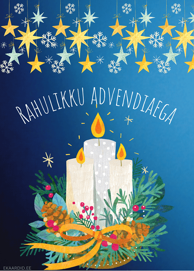 Soovi rahulikku advendiaega selle kauni advendi kaardiga. Kaardil on kujutatud kolm küünalt ja rippuvad tähed. See on ideaalne advendikaart lähedastele.