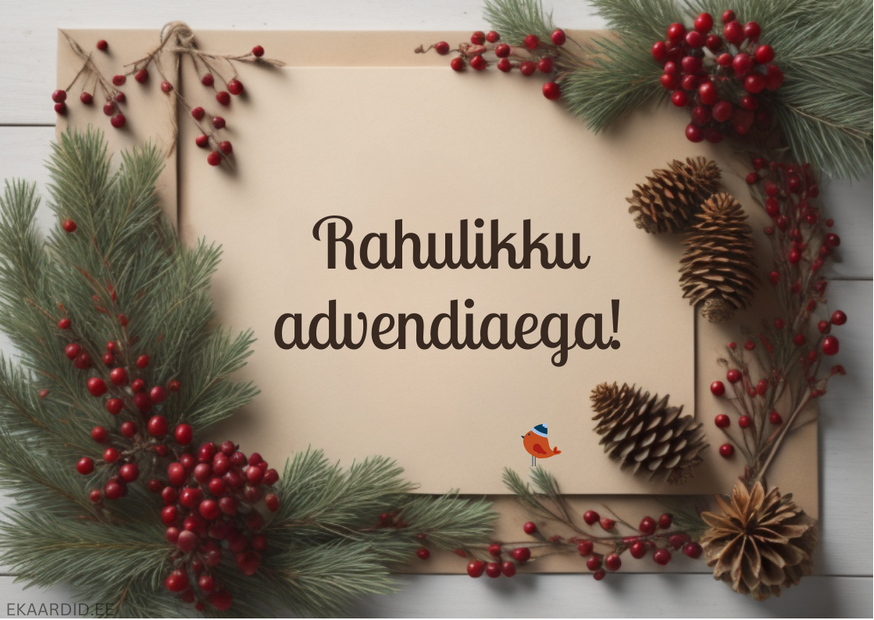 Soovi lähedastele rahulikku advendiaega selle kauni advendikaardiga. Kaart on kaunistatud kuuseokstega, punaste marjade ja käbidega. See on ideaalne advendiaja tervituskaart.
