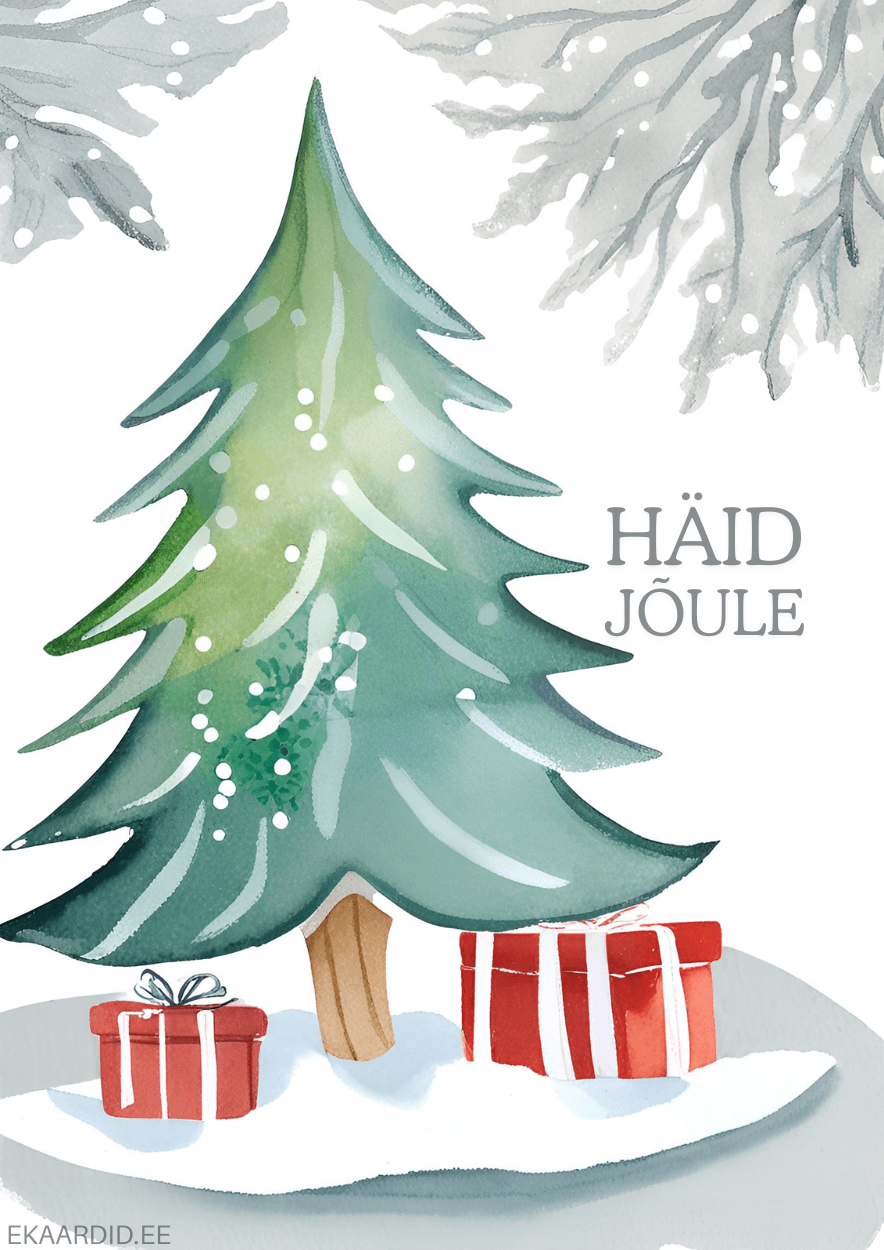 Soojad jõulusoovid selle kauni akvarell-stiilis jõulukaardiga. Kaardil on kujutatud lumega kaunistatud kuusk ja kingitused. See on ideaalne jõulukaart lähedastele.