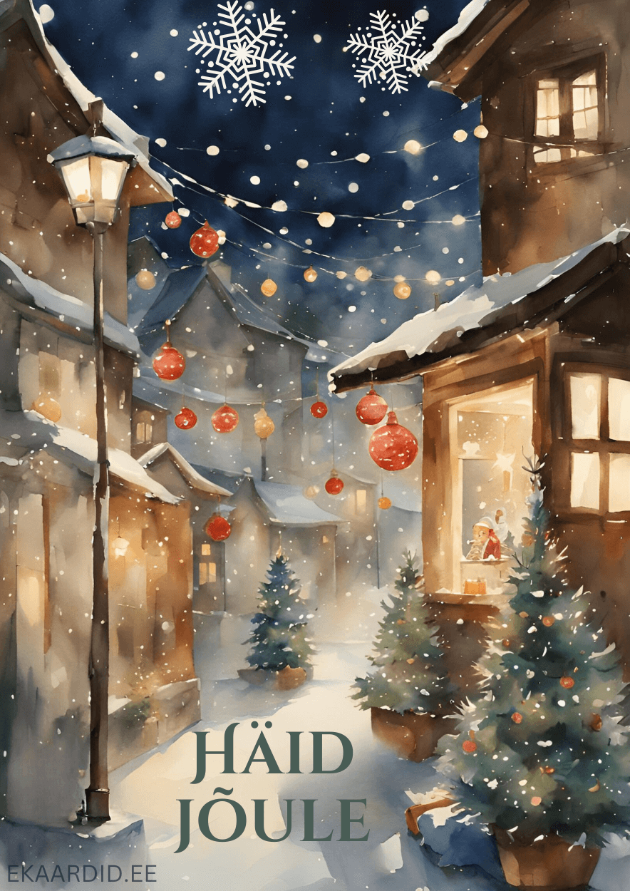 Soojad jõulusoovid lumise tänavamaastikuga akvarell-jõulukaardil. Ideaalne jõulukingitus lähedastele.