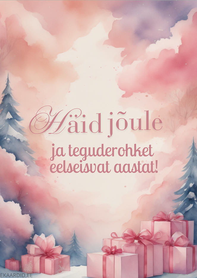 Soovi oma lähedastele rõõmsaid jõule ja head uut aastat selle kauni akvarell-stiilis jõulukaardiga. Kaardil on kujutatud roosad kingitused ja lumikattelised kuused. See on ideaalne jõulukaart perele ja sõpradele.