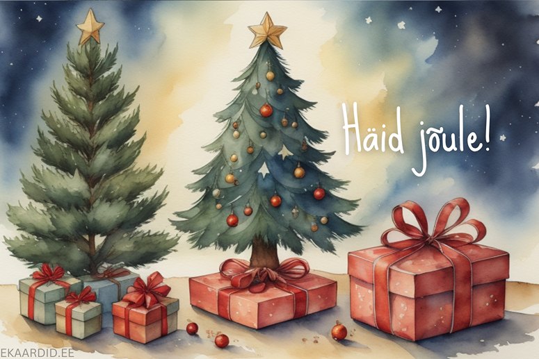 Soojad jõulusoovid akvarell-stiilis kaardiga. Kaunis kujundus kolme jõulupuud ja kingitustega. See on ideaalne jõulukaart lähedastele.