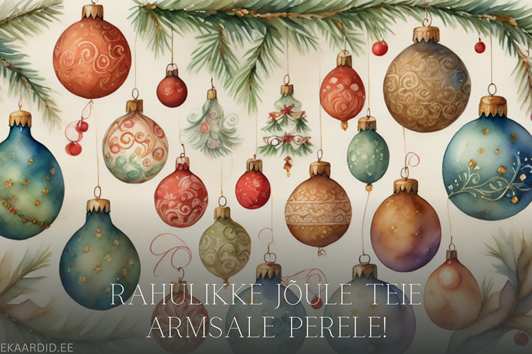 Soovi oma lähedastele rahulikke jõule selle kauni akvarell-stiilis jõulukaardiga, millel on kujutatud värvikaid jõulukuuke. Ideaalne jõulukingitus perele ja sõpradele.