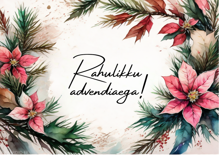 Soovi oma lähedastele rahulikku advendiaega selle kauni akvarell-stiilis jõulukaardiga. Kaardil on kujutatud jõulutäht ja kuuseoksad. See on ideaalne advendi- ja jõulukingitus.