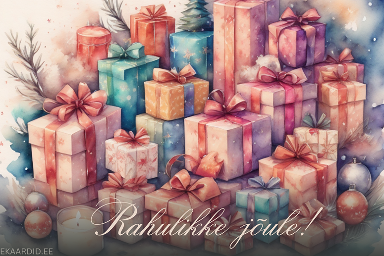 Soovi oma lähedastele rahulikke jõule selle kauni akvarell-stiilis jõulukaardiga, mis on kaunistatud paljude värvikirevate kingitustega. See on ideaalne tahtpäeva kaart.