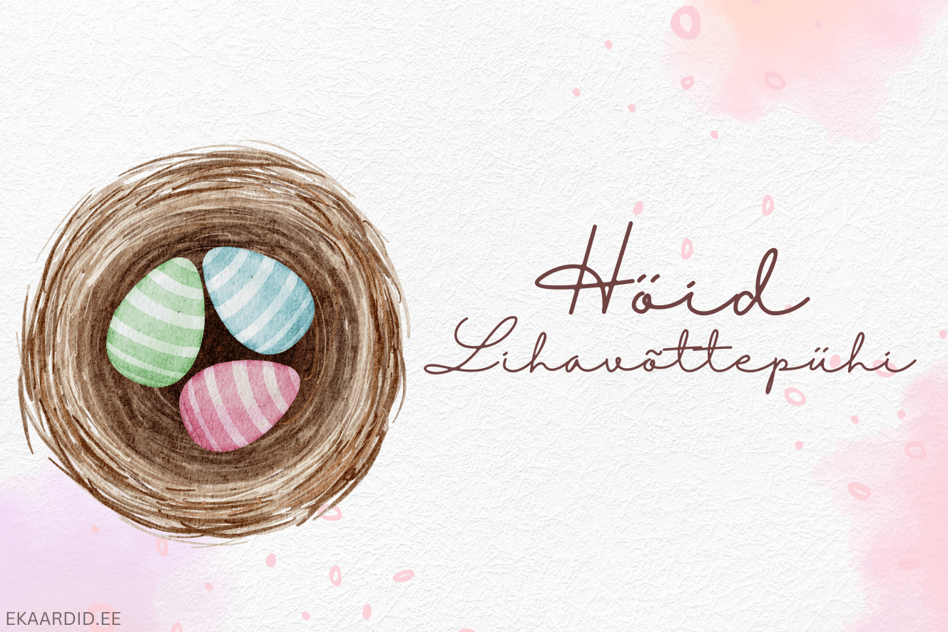 Soovi oma lähedastele rõõmsaid lihavõttepühi selle armsa akvarell-stiilis kaardiga, millel on pesas triibulised munad. See on ideaalne lihavõttekaart perele ja sõpradele.