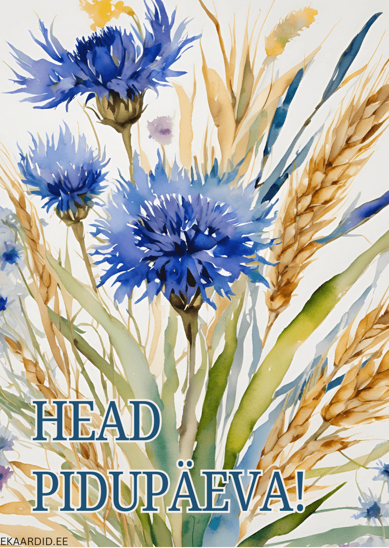 Soovi oma lähedastele head pidupäeva selle kauni akvarell-stiilis õnnitluskaardiga, mis on kaunistatud siniste karikakarde ja nisutõlvikutega. Ideaalne valik erinevateks pidupäevadeks.
