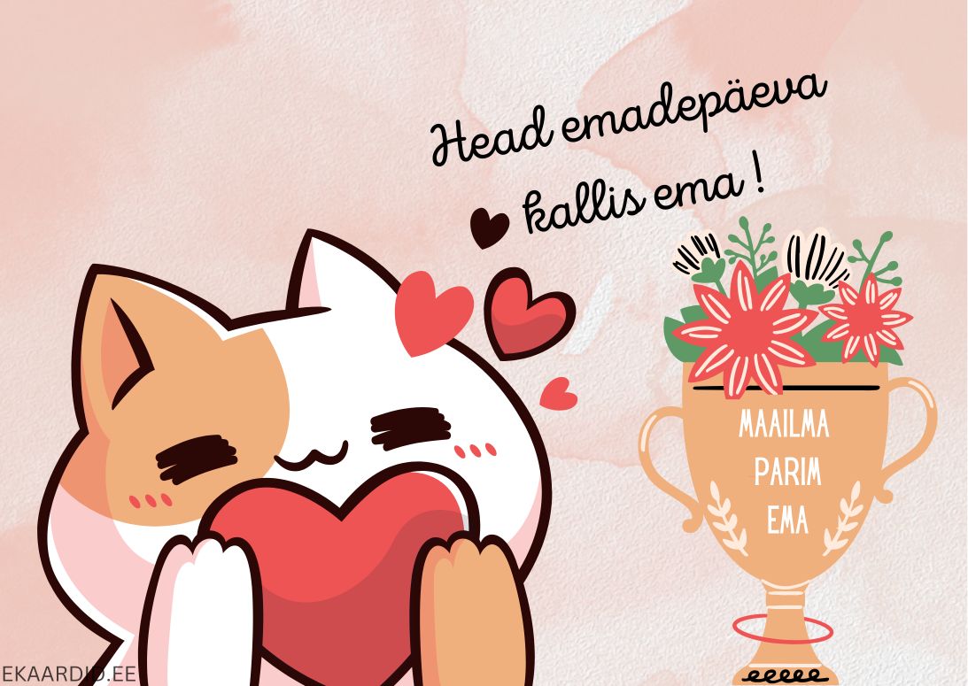Soovi oma kallile emale ilusat emadepäeva selle armsa kassikesega kaardiga. Kaardil on kujutatud armas kass, kes hoiab südant ja karikas, millel on kirjas "Maailma parim ema". See on ideaalne tahtpaevad-emadepaev kaart.