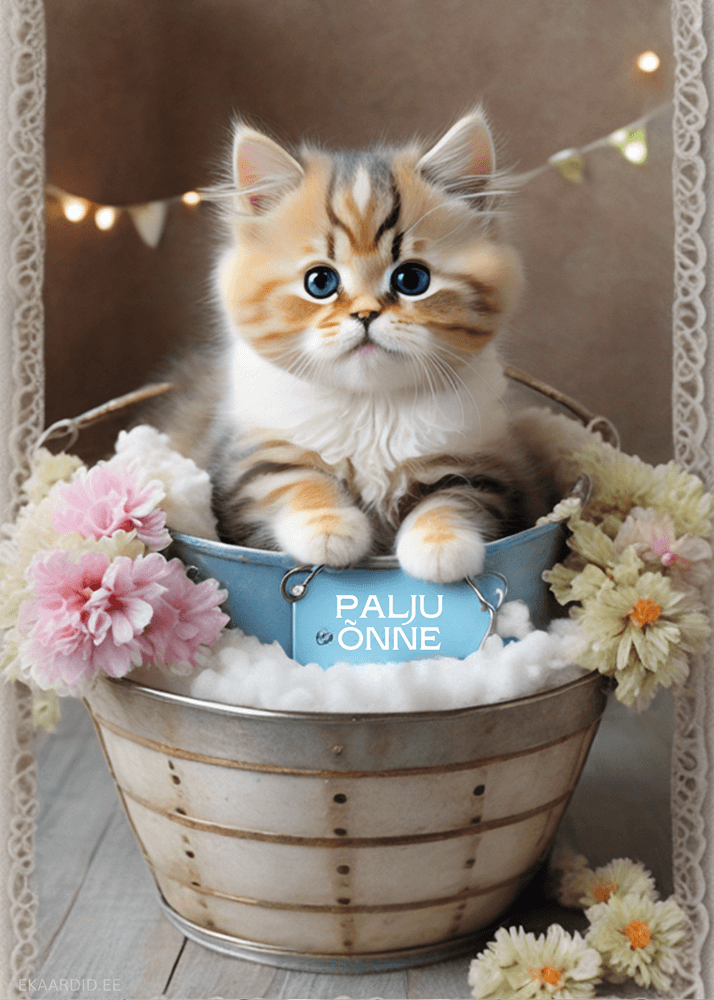 See on armas sünnipäevakaart, millel on nunnu kassipoeg lilledega ämbris. Soovi oma lähedasele palju õnne selle armsa kaardiga!