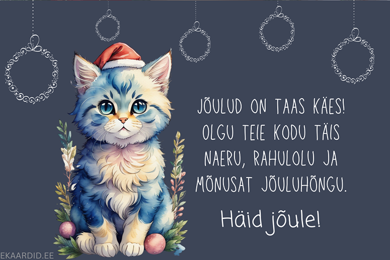Soovi oma lähedastele rõõmsaid jõule selle armsa jõulukassiga kaunistatud kaardiga. See on ideaalne jõulukaart, mis toob sooja ja hubast meeleolu.