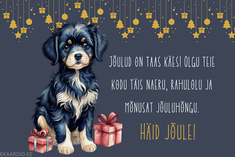 Soovi oma lähedastele rõõmsaid jõule selle armsa koerakesega jõulukaardiga. See on ideaalne jõulukaart, mis toob naeratuse igaühe näole.