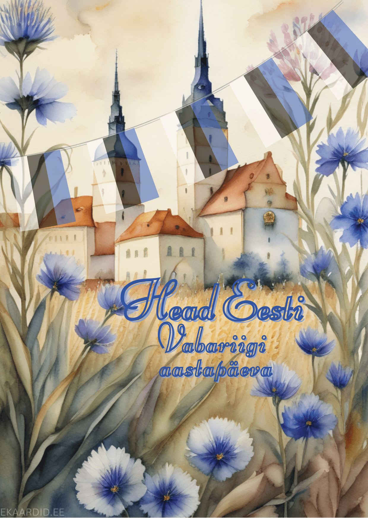 Soovi Eestile õnne selle kauni akvarell-stiilis kaardiga. Kaardil on kujutatud Eesti linnuseid ja siniseid lilli. See on ideaalne kaart Eesti Vabariigi aastapäeva tähistamiseks.