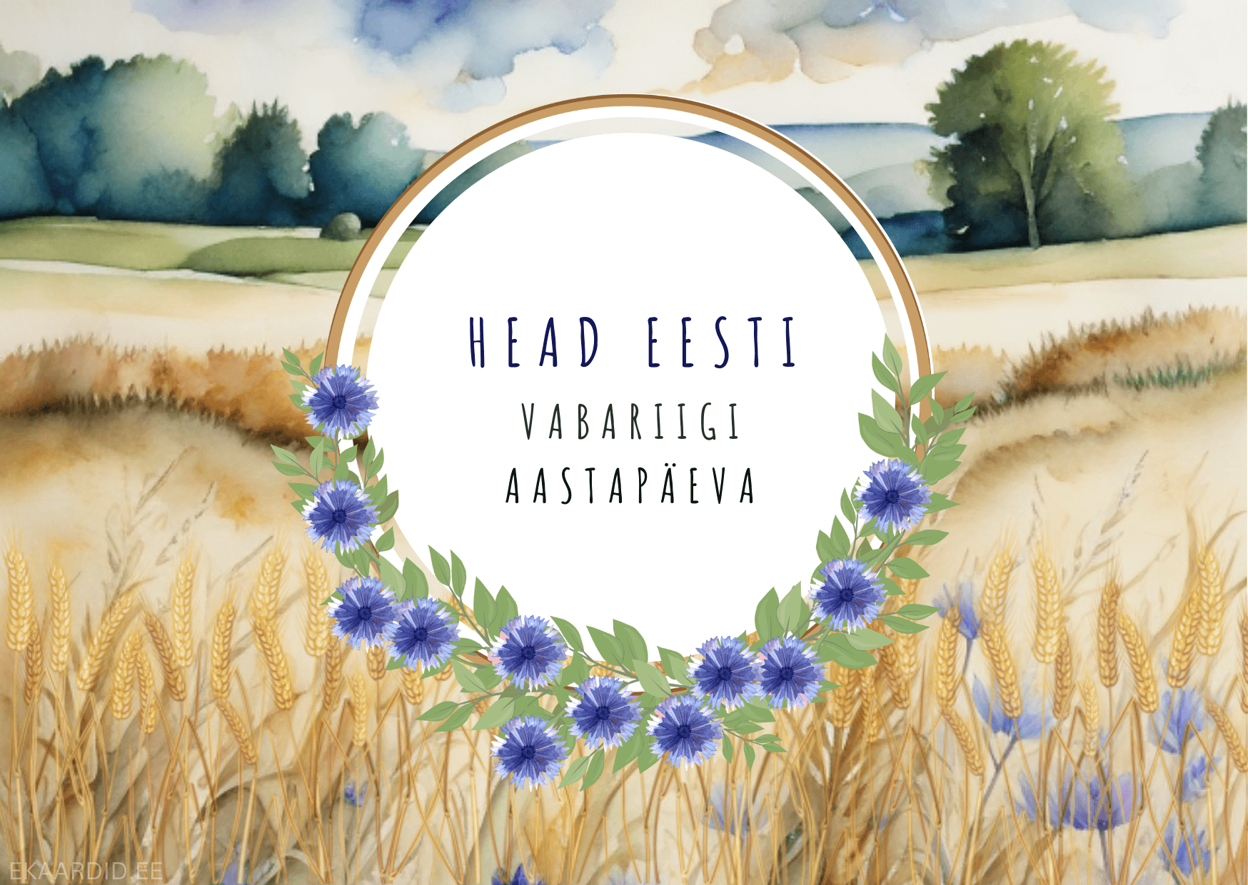 Soovi Eestile õnne selle kauni, nisuvälja ja siniste lilledega kaunistatud Vabariigi aastapäeva kaardiga. See on ideaalne kaart Eesti Vabariigi aastapäeva tähistamiseks.