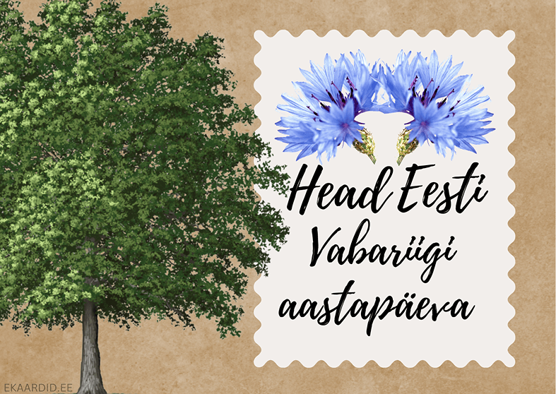 Eesti Vabariigi aastapäeva kaart puu ja siniste lilledega