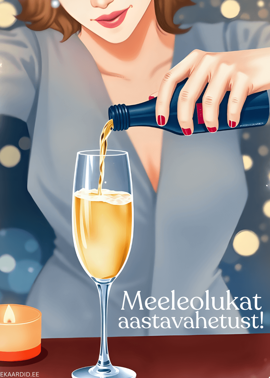 Soovi oma lähedastele meeldivat aastavahetust selle elegantse kaardiga, millel on kujutatud šampanjaklaas ja sädelev õhkkond. Ideaalne kaart aastavahetuse tervituseks.