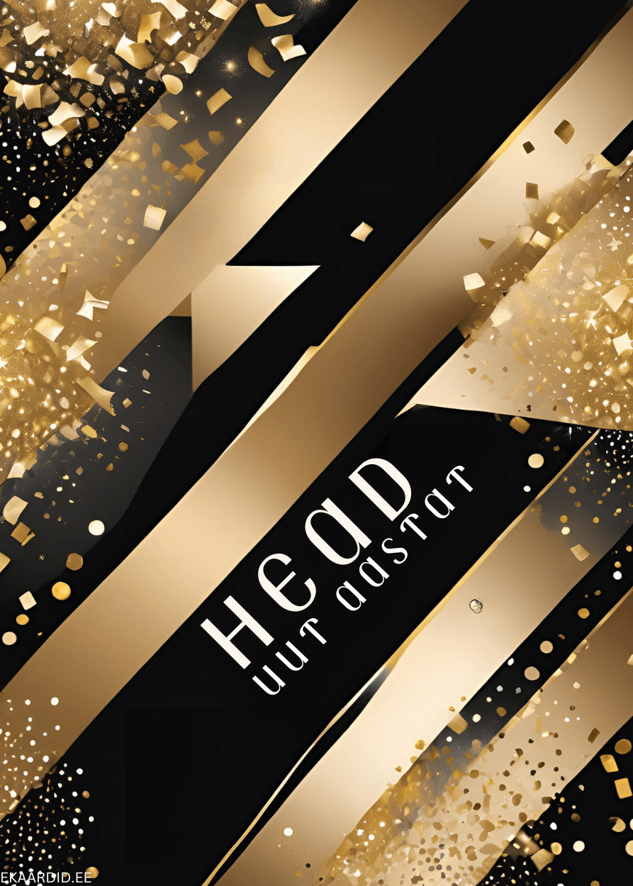 Soovi oma lähedastele head uut aastat selle elegantse kaardiga, mis on kaunistatud kuldsete konfeti ja triipudega. Ideaalne aastavahetuse tervituskaart.
