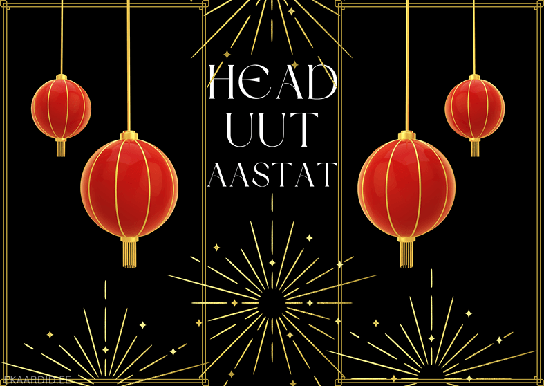 Soovi oma lähedastele head uut aastat selle elegantse kaardiga, mis on kaunistatud punaste laternate ja kuldsete sädelustega. Ideaalne aastavahetuse tervituskaart.