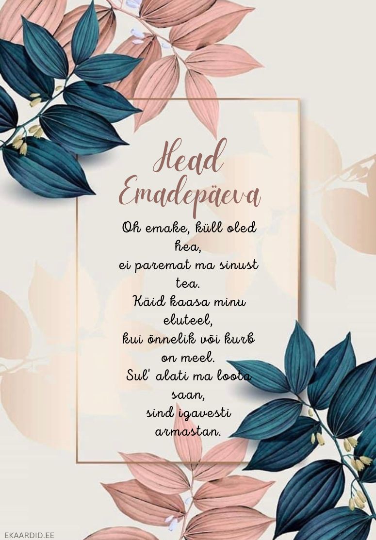 Soovi oma emale ilusat Emadepäeva selle elegantse kaardiga, mis on kaunistatud roheliste ja roosade lehtedega. See on ideaalne tahtpaevad-emadepaev kaart, mis väljendab sügavat armastust ja tänu.