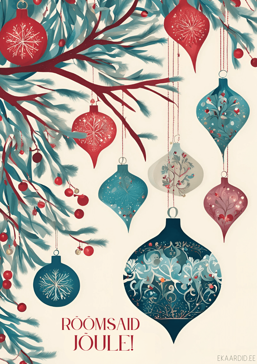 Soovi oma lähedastele rõõmsaid jõule selle kauni jõulukaardiga, millel on kujutatud elegantsed, värvikirevad jõulukuulid. See on ideaalne jõulukaart lähedastele ja sõpradele.