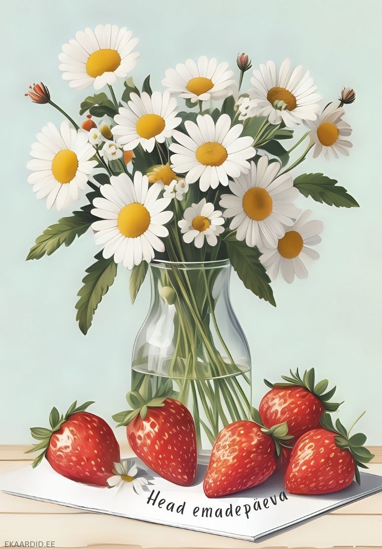 Soovi oma emale ilusat emadepäeva selle õrna ja kauni kaardiga. Kaardil on kujutatud karikakarde kimbuke ja maasikad – sümboliseerides armastust ja hellust. See on ideaalne tahtpaevad-emadepaev kaart.