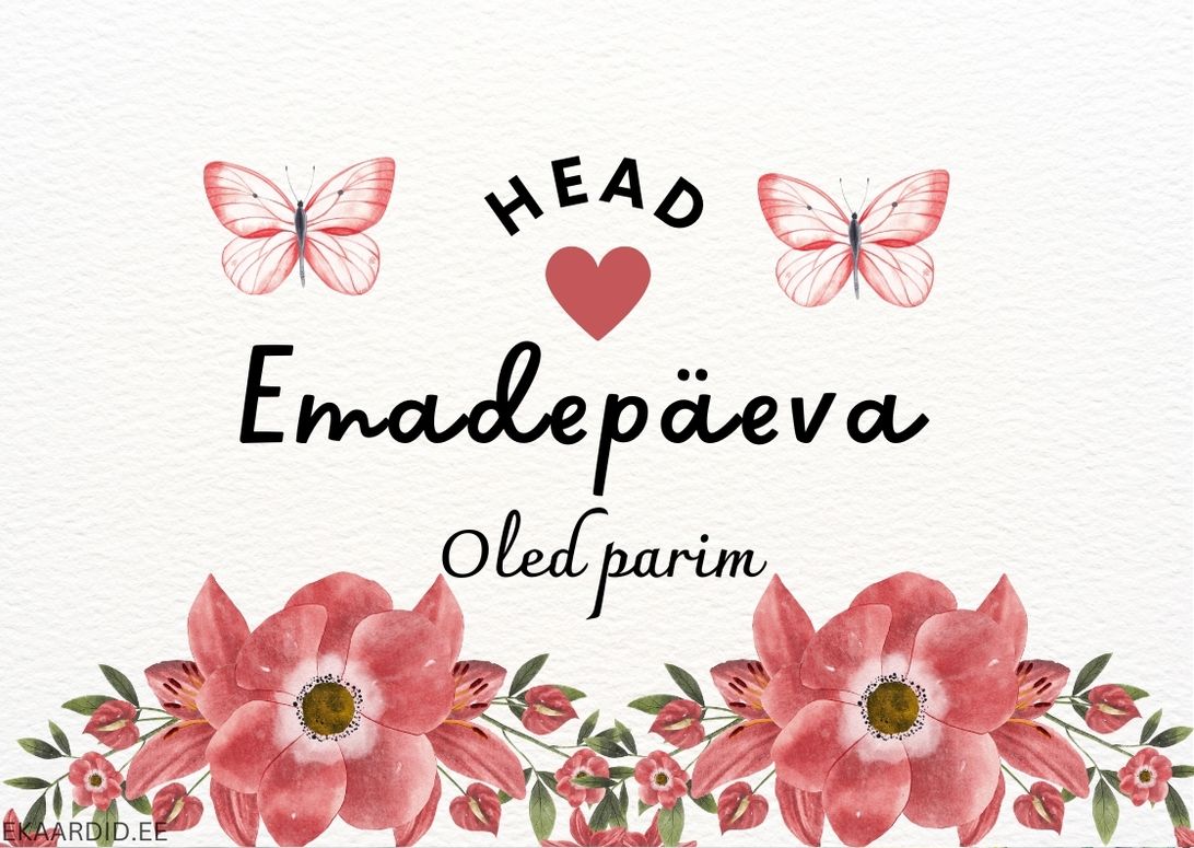 Soovi oma emale ilusat emadepäeva selle kauni kaardiga. Kaart on kaunistatud punaste lillede ja liblikatega. See on ideaalne tahtpäevakaart emadepäevaks.