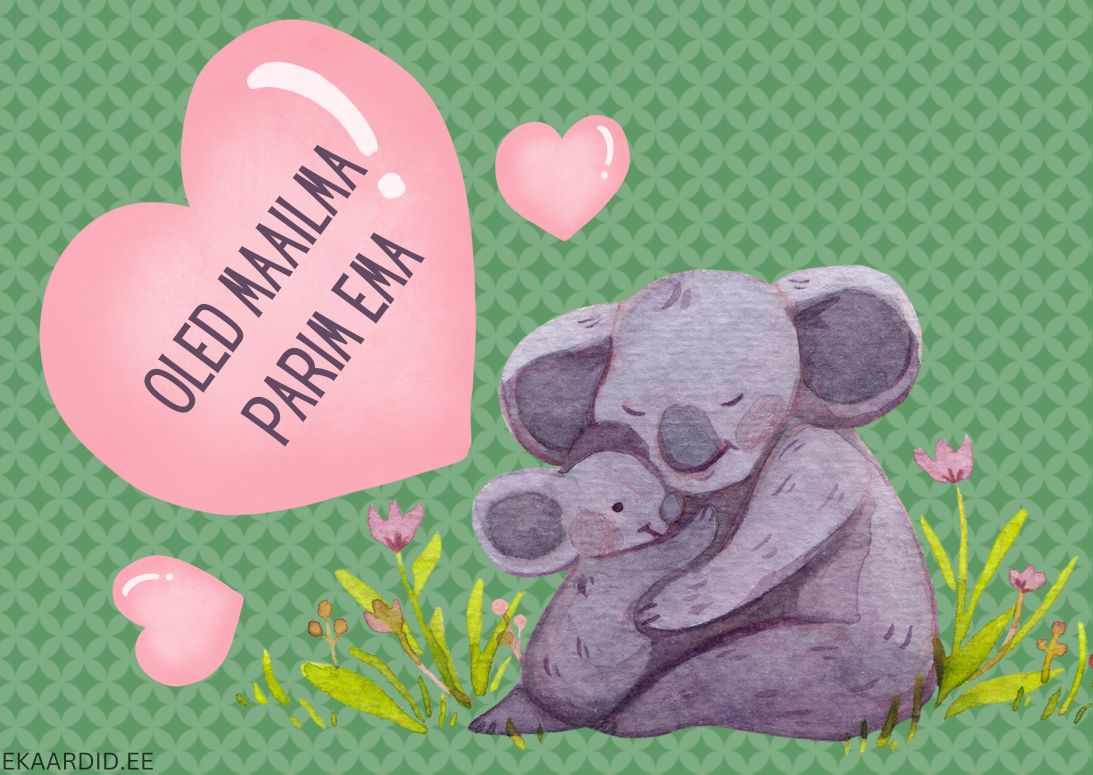Sooja ja südamliku emadepäeva soovidega kaart, millel on kujutatud kaht koalat. See on ideaalne tahtpäevakaart, et väljendada oma armastust ja tänu emale.