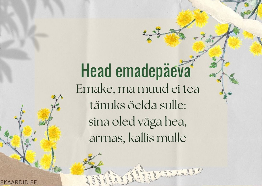 Soovi oma emale ilusat emadepäeva selle õrna ja kauni kaardiga, mis on kaunistatud kollaste lilledega. See on ideaalne emadepäevakaart, mis väljendab sinu armastust ja tänu.