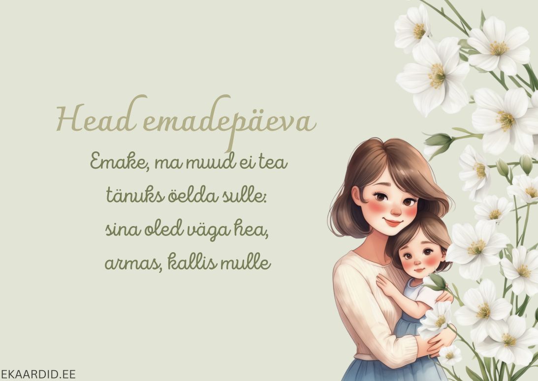 Soovi oma emale ilusat emadepäeva selle õrna ja liigutava kaardiga. Kaardil on kujutatud ema ja laps ning valged lilled, mis sümboliseerivad puhtust ja armastust. See on ideaalne tahtpaevad-emadepaev kaart, mis väljendab sinu südamlikke tundeid.