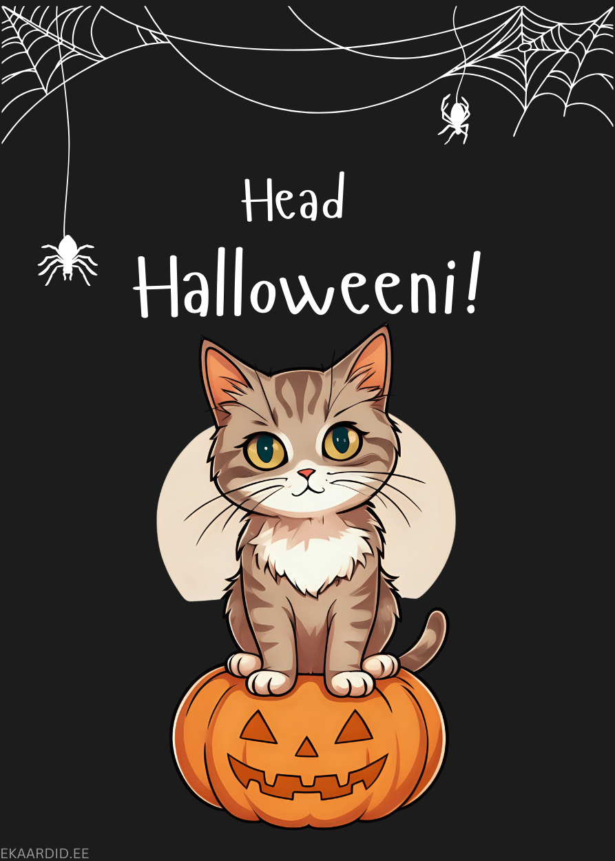 See on armas Halloweeni kaart, millel on triibuline kass kõrvitsa peal. Ideaalne Halloweeni tervituseks sõpradele ja perele.