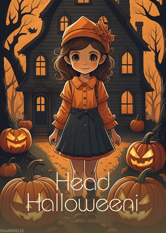 See on armas Halloweeni kaart, mis sobib suurepäraselt sõpradele ja perele. Kaardil on kujutatud armas tüdruk ja kõrvitsad.