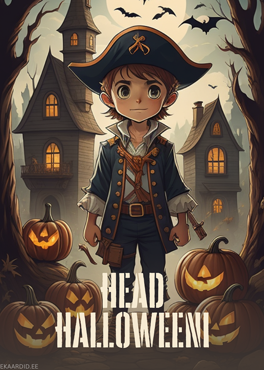 See on Halloweeni kaart, mis kujutab kaptenina riietatud last ja hõõguvaid kõrvitsa laternaid. Ideaalne Halloweeni õhtuks!