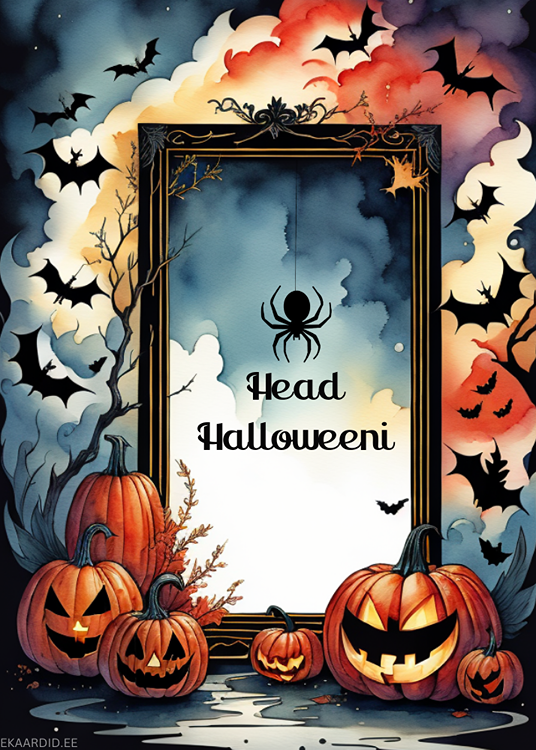 Halloweeni kaart kõrvitsate ja nahkhiirtega