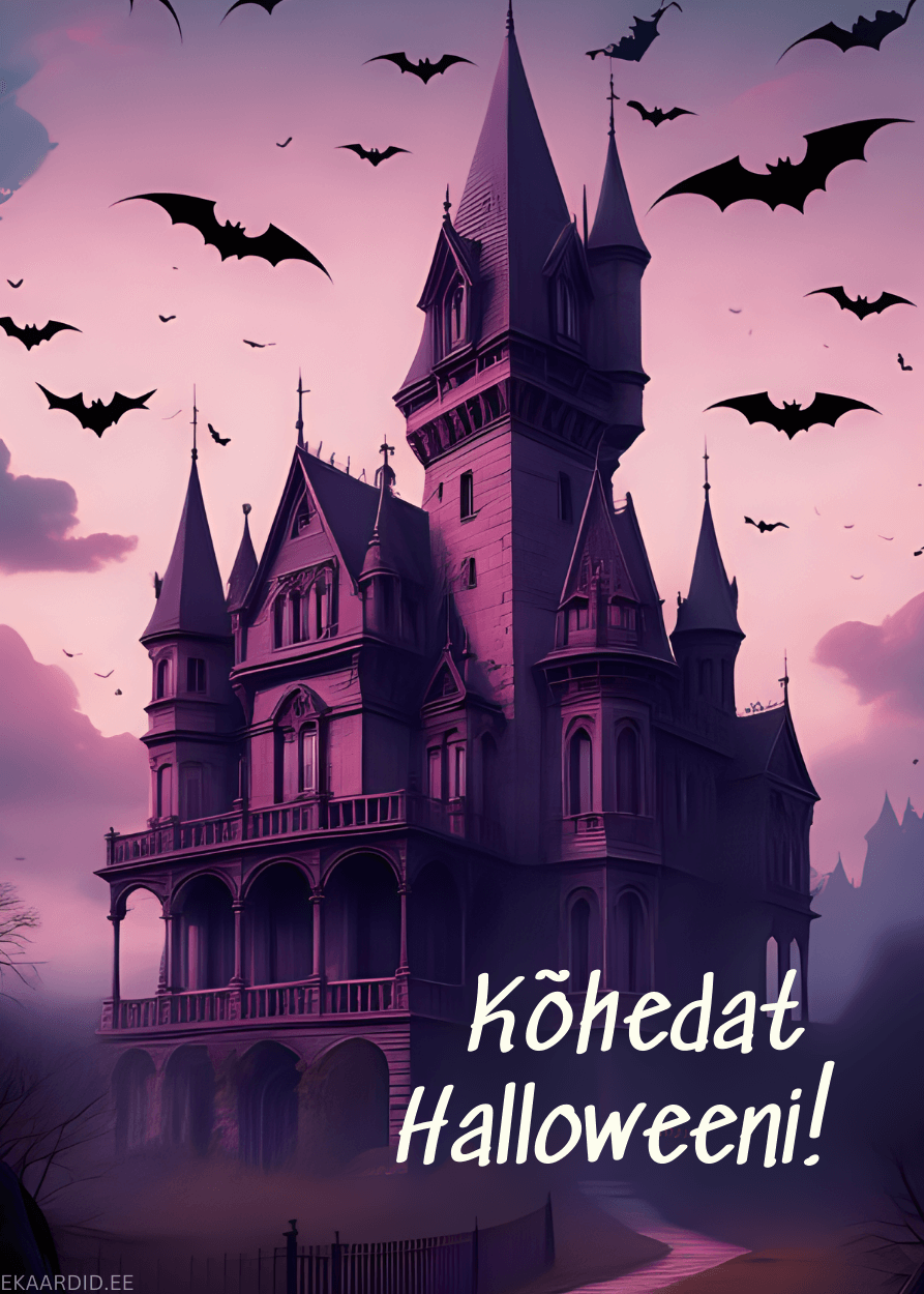 See on õudselt ilus Halloweeni kaart, mis kujutab endast salapärast lossi ja lendavaid nahkhiiri. Ideaalne kaart Halloweeni puhul.