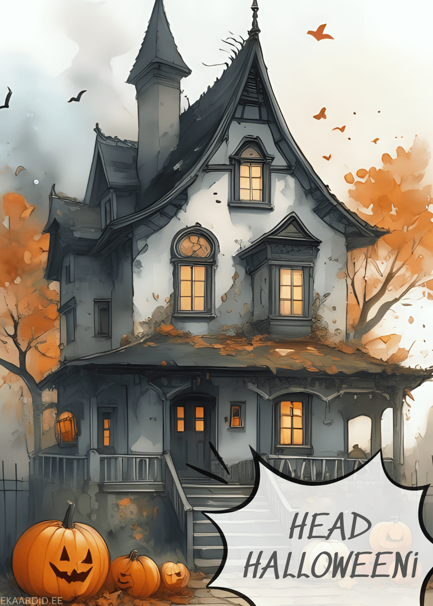 See on suurepärane Halloweeni kaart, mis kujutab endast salapärast ja veidi kummituslikku maja sügisese taustaga. Ideaalne kaart Halloweeni pidustusteks.