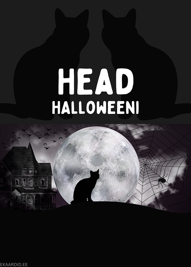 See on õudselt lahe Halloweeni kaart, mis sobib suurepäraselt sõpradele ja perele. Kaardil on kujutatud mustad kassid ja kummituslik maastik.