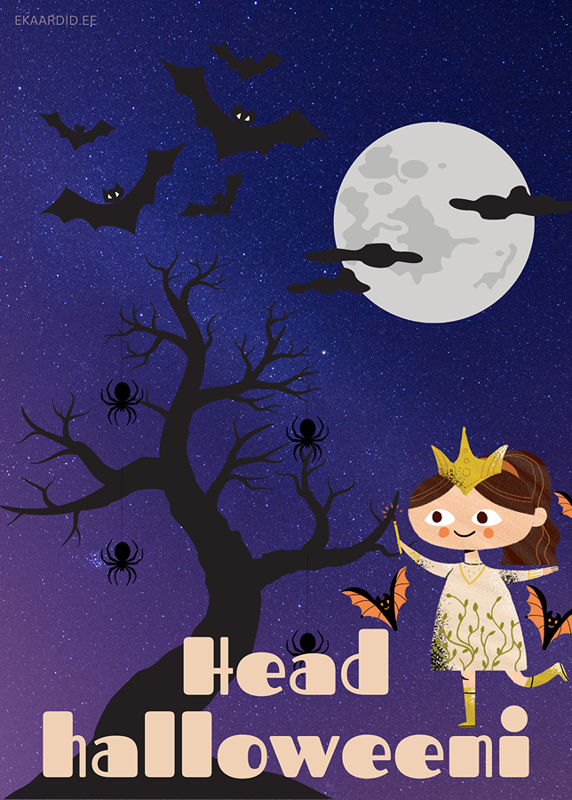 See on armas Halloweeni kaart, mis sobib suurepäraselt Halloweeni puhkuse tähistamiseks. Kaardil on kujutatud printsess, nahkhiired ja ämblikud.