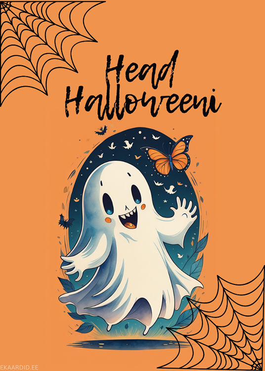 See on armas Halloweeni kaart, millel on rõõmsameelne kummitus ja liblikas. Ideaalne kaart Halloweeni puhul sõpradele ja perele soovide saatmiseks.